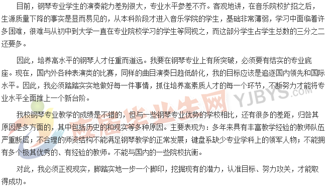 我個性熱情奔放,熱愛藝術(shù)事業(yè),家庭條件也能支持我的夢想,而且我學習鋼琴專業(yè)已有十多年的經(jīng)歷。在現(xiàn)在鋼琴教學整體水平較低,師資力量較差的市場背景下,真正能從事鋼琴專業(yè)的很少。如果專業(yè)水平較高,將來的就業(yè)是很有保障的,因為能達到高級鋼琴專業(yè)水平的人很少。