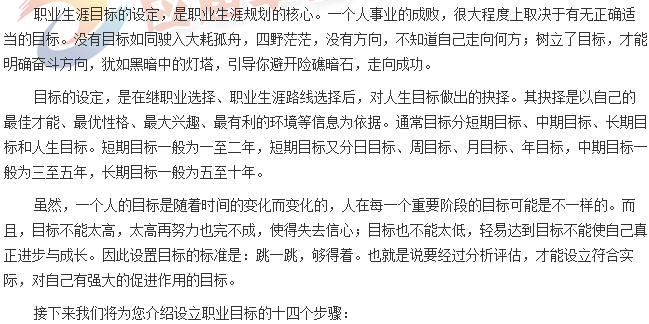 在確定了職業(yè)生涯目標后,行動便成了關(guān)鍵的環(huán)節(jié)。沒有達成目標的行動,目標就難以實現(xiàn),也就談不上事業(yè)的成功。
