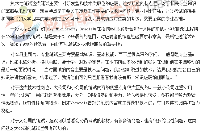 這類(lèi)筆試一般來(lái)說(shuō)更常見(jiàn),對(duì)于應(yīng)試者的專(zhuān)業(yè)背景的要求也相對(duì)寬松。非技術(shù)性筆試的考察內(nèi)容相當(dāng)廣泛,除了常見(jiàn)的英文閱讀和寫(xiě)作能力、邏輯思維能力、數(shù)理分析能力外,有些時(shí)候還會(huì)涉及到時(shí)事政治、生活常識(shí)、情景演繹,甚至智商測(cè)試等。下面我們來(lái)做一個(gè)詳細(xì)的介紹和分析。