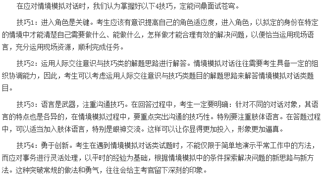 那什么是情境模擬對話呢?一般而言,是通過設置與擬任崗位有很強匹配性的各種典型情境,讓考生在特定的環(huán)境中扮演一定的角色,處理各種事務以及問題和矛盾的試題?脊偻ㄟ^考生完成任務的過程、結果進行綜合分析,評價考生處理問題的能力,衡量考生的綜合素質(zhì)。情境模擬對話題分為現(xiàn)場講話類、處理日常工作類和處理人際關系類三種類型。
