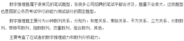 數(shù)字推理題是公務(wù)員考試中行政能力測(cè)試的題目類型之一,通常也會(huì)出現(xiàn)在一些名企招聘的筆試題中。這類題型要求應(yīng)試者觀察數(shù)列的變化規(guī)律,選出相應(yīng)的空缺項(xiàng)?疾榈氖枪P試者分析數(shù)字之間的聯(lián)系,對(duì)運(yùn)算能力的要求不高。所以只要經(jīng)過(guò)足夠的練習(xí),這部分應(yīng)該是可以拿到高分的。但是由于測(cè)試時(shí)間較短,需筆試者掌握基本的速算方法。