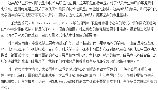 除了英文的閱讀和寫(xiě)作以及技術(shù)性筆試之外,上文中還提到了其他一些筆試的類(lèi)型。一般來(lái)說(shuō),對(duì)于像數(shù)理分析能力,邏輯推理能力和語(yǔ)言表達(dá)能力方面的考察,準(zhǔn)備的途徑并不十分的多,有針對(duì)性的準(zhǔn)備的效果也不見(jiàn)得特別好。但是,一般來(lái)說(shuō),大部分的應(yīng)試者在這一部分的表現(xiàn)都不差。原因在于,雖然不同的應(yīng)試者的專(zhuān)業(yè)背景都不同,但是基本的分析能力和邏輯思維的能力是每一個(gè)學(xué)科都需要的,在平時(shí)的學(xué)業(yè)中每個(gè)人都會(huì)有意無(wú)意的去練習(xí)和拓展自己這方面的能力。因此,雖然筆試的題目你從來(lái)沒(méi)有見(jiàn)過(guò),但是其考察的本質(zhì)是相同的,只不過(guò),筆試題目以另外一種你并不熟悉的形式來(lái)表現(xiàn)而已。