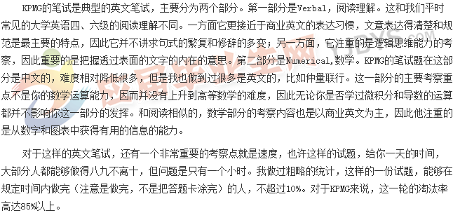 英文筆試是在所有的筆試中占的比例最大的一類(lèi)非技術(shù)性筆試,其考察的重點(diǎn)主要是閱讀理解能力和寫(xiě)作能力,即表達(dá)能力。我們結(jié)合KPMG筆試的例子來(lái)加以說(shuō)明。