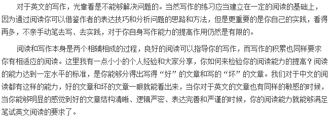 其次,筆試的英文不是看小說(shuō),看過(guò)就算,重要的是對(duì)文章內(nèi)容的理解,而你平時(shí)涉獵的素材,是不可能在文章后面出幾個(gè)判斷題的。因此,我建議你在閱讀這些文章的時(shí)候,有意識(shí)的在讀完整篇之后,停下來(lái)想一想,它說(shuō)了哪些內(nèi)容,是怎么來(lái)組織文章的觀點(diǎn)和論據(jù)的,你在閱讀的時(shí)候有沒(méi)有碰到什么理解上的困難,是因?yàn)樵~匯量的不足還是對(duì)含義把握能力的欠缺。當(dāng)你每次都能夠做這樣的一個(gè)簡(jiǎn)單的回顧工作時(shí),你的閱讀能力的提升會(huì)更快。
