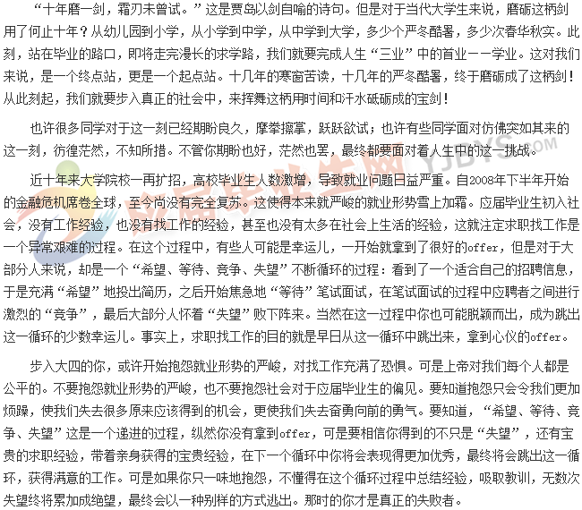 曾幾何時,望著師兄那筆挺的西裝和帥氣的領(lǐng)帶,你是否充滿了羨慕和憧憬呢?曾幾何時,看著師姐一身職業(yè)裝的打扮,你的心頭是否涌起了一番別樣的滋味呢?四年時間,彈指瞬間。而今的你,即將穿著正裝,進(jìn)入職場,去親身經(jīng)歷那沒有硝煙的戰(zhàn)爭。親愛的應(yīng)屆畢業(yè)生,你準(zhǔn)備好了嗎?