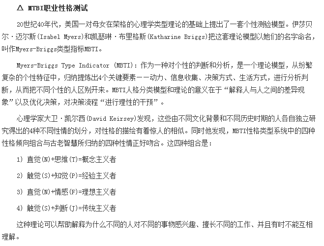 每個人從小到大都會積累這些自我認(rèn)識,別人的一句話評論,老師對你作文的評語都是你認(rèn)識自己的途徑。專業(yè)認(rèn)識自我的方法有很多,世界上幫助人們對自己進行客觀的自我評估的方法有很多,如心理測試,應(yīng)用韋氏量表、瑞文智力測驗智商,卡特爾的16PF的人格測試都是具體應(yīng)用。其中國際上最為流行的職業(yè)人格評估工具莫過于MTBI職業(yè)性格測試了。