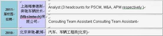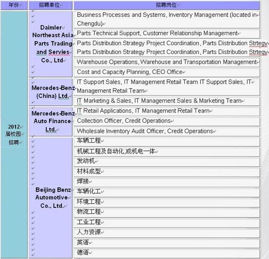 比較 2010、2011、2012三屆校園招聘職位情況可以發(fā)現(xiàn),由于 2011年未進(jìn)行較大規(guī)模的校園招聘,2012屆校園招聘開放可供申請(qǐng)的崗位明顯增多。奔馳每年招聘的所有崗位都招收應(yīng)屆畢業(yè)本科生,同時(shí)對(duì)應(yīng)聘者的條件有一定要求。