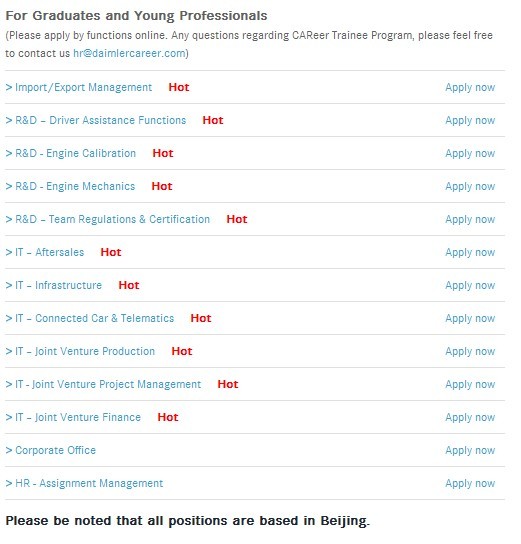 5、如求職者想了解現(xiàn)在奔馳汽車公司對應(yīng)屆畢業(yè)生開放哪些職位,可點(diǎn)擊“工作機(jī)會”進(jìn)行查看。點(diǎn)擊進(jìn)入后,如圖所示,會有現(xiàn)時(shí)接受網(wǎng)申的職位列表,求職者可根據(jù)自身需要選擇職位的網(wǎng)上申請。