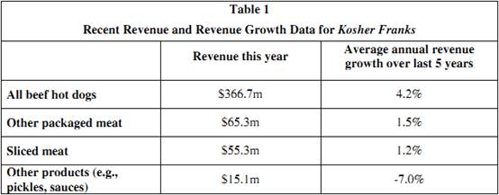 Table 1 shows Kosher Franks’ data on this year’s sales revenue and the average annual revenue growth over the last 5 years. The data in Table 1 is broken down by major product category.