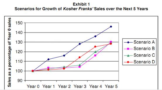 The CEO of Kosher Franks has asked a McKinsey team to help him identify ways to improve sales growth while maintaining good levels of profitability. He states that a 10% annual sales growth should be the target. In five years time, he wants to be able to look back and see an annual sales growth of 10% or more for each of the previous 2 years, or Kosher Franks will no longer be part of FoodInc. Exhibit 1 represents four potential scenarios for Kosher Franks’ future sales growth, with Year 0 representing this year.