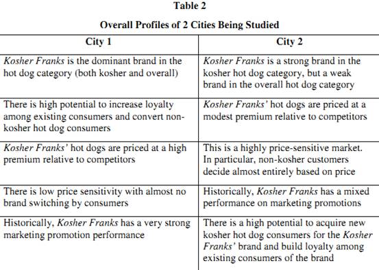 After conducting some analysis, the team compiles overall summary profiles of the hot dog market in two of the cities being studied. These profiles are given in Table 2.
