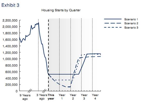 Exhibit 3 shows projections for the housing ‘starts’ in the U.S. over the next five years. A housing ‘start’ is the commencement of construction on a housing unit. The number of housing starts are plotted by quarter each year under three different forecasting scenarios. Vertical dotted lines indicate the first quarter, or Q1, of the year. As a historical benchmark, first quarter housing starts are included for 3 years ago and 9 years ago. Assume that it is currently the first quarter of the year.