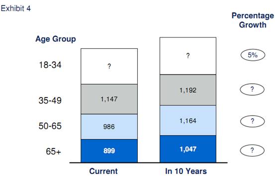 Exhibit 4 shows the 4 age group segments the team identified who are interested in multi-family apartments in the geographical areas where RentEstate is already present. Exhibit 4 displays each age group segment’s current and forecasted number of households (in thousands). Exhibit 4 only includes households who have the respective minimum income to afford Class A or Class B rents. The percentage on the right-hand side of the exhibit shows the percentage growth of the segment over the next 10 years.