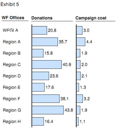 The team gathers more data on WFGLA and on other WF offices. Exhibit 5 shows the total donations and total campaign costs in million British pounds (£) for various WF offices last year.
