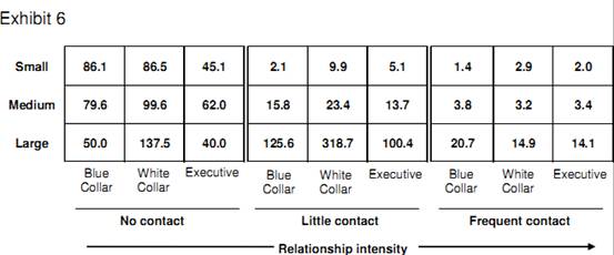 Exhibit 6 shows the number of employees in thousands in each segment in the Greater London Area. Employees are categorized by the size of the company they work for, as well as their level of contact with WFGLA so far, or ‘relationship intensity’. The goal is to subsequently increase the relationship intensity for each segment, so that each segment moves closer to the ‘frequent contact’ group.