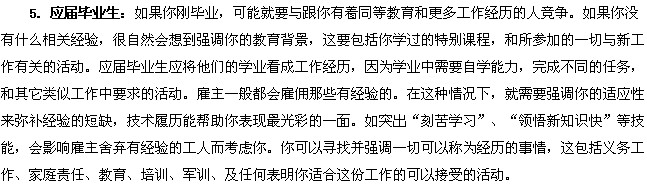 4.工作經(jīng)歷與目前工作目標(biāo)無(wú)關(guān):如果你以前的工作經(jīng)歷跟將來(lái)想做的工作無(wú)關(guān)時(shí),你可以采用技能履歷,好處是強(qiáng)調(diào)了那些從其它工作種學(xué)習(xí)使用的,而能在新工作中運(yùn)用的技能。又如轉(zhuǎn)變行業(yè)要讓雇主接受,是需要你的理由的,這就需要你舉出在你以前經(jīng)歷中哪些是表現(xiàn)在新行業(yè)中的能力,你在新行業(yè)中獲取成功的計(jì)劃是什么。