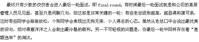 在經(jīng)歷了萬馬齊“鳴”的第一輪篩選之后,不少應(yīng)試者會接到進階選拔的通知,開始面試的最關(guān)鍵階段。這就不再是大把大把的篩人了,而是一個精挑細選的過程。通常都是由級別比較高的人來主持面試,面試的時間也會更長,程序也更復(fù)雜,往往要經(jīng)歷兩個以上考官的評估,只有少數(shù)的應(yīng)試者會脫穎而出。