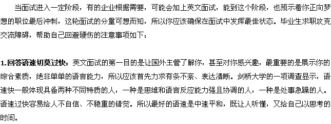 如果前面都很順利,最后一輪面試一般就是和公司的總裁面對面了。外企的總裁一般是老外,當然面試就變成全英語的了。面試在求職過程中,可以說是壓力最大的一個環(huán)節(jié)。而英語面試又是比較難的一環(huán),第三輪當然是難上加難?偛迷儐柕膯栴}一般會和公司精神、企業(yè)文化、個人品質(zhì)、福利薪水有關(guān)。面對外國老板連珠炮似的提問,如果能回答得從容不迫、簡明扼要,恰當中肯,合乎口味,那么肯定會大大增加你的錄取機會。