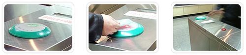 乘客右手持票,在進口閘機面板的圓形“讀卡器”上方稍作停留以供閘機檢票;