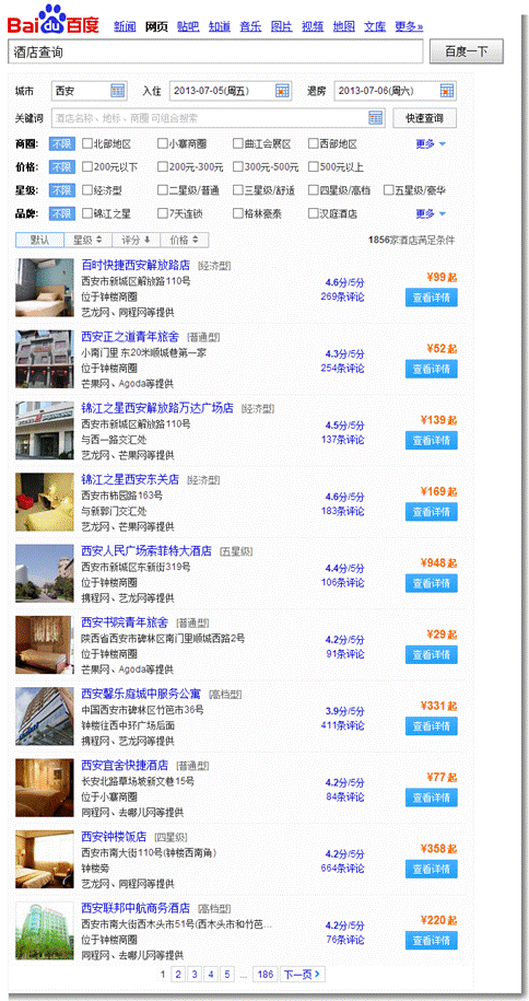 權(quán)威酒店查詢:(百度酒店查詢),求職者可以事先查好來到西安后目的地附近的酒店名稱及所在位置,下車后直奔酒店訂好房間住下。下圖為百度酒店查詢頁面,供求職者參考。
